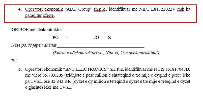 Nga dokumentacioni që disponon JOQ vihet re se kanë marrë pjesë 5 kompani. Njëra prej tyre nuk ka dorëzuar fare ofertë, ndërsa dy kompani të tjera kanë paraqitur oferta më të ulëta se ajo e shpallur fituese. Kjo do të thotë se shteti mund të kursente para, por në vend të kësaj është zgjedhur një ndër ofertat më të shtrenjta. Diferenca mes vlerës së fituar nga kompania e Vilma Nushit dhe ofertës më të ulët arrin në rreth 74 milionë lekë të vjetra, një shumë e konsiderueshme që del nga xhepat e qytetarëve.