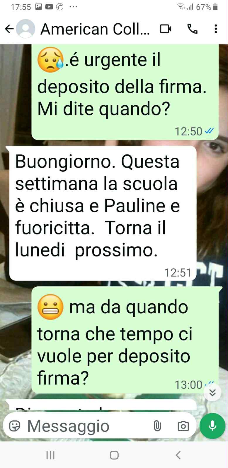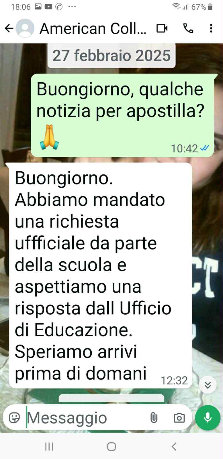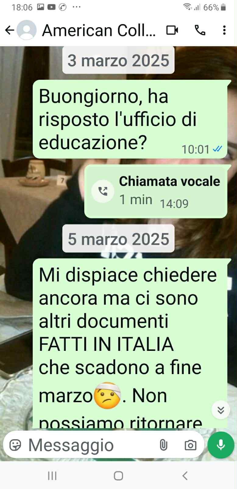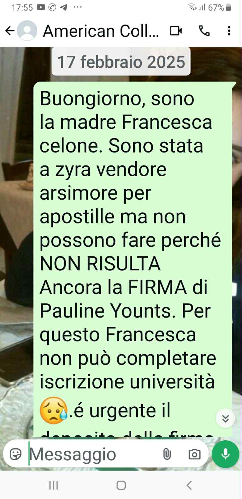 Mirëmëngjes, unë jam një italiane që jetoj në Durrës, vajza ime ka ndjekur studimet në Albanian College në Durrës dhe është diplomuar në maj 2024. Kur zbuluam që universiteti i Tiranës nuk kishte më degën e studimit që vajza ime donte të ndiqte, ajo vendosi të shkonte në universitet në Spanjë. Kështu në tetor 2024 nisëm të gjithë dokumentet. Më pas nisi procedura për kërkesën e vulës apostiles mbi këto dokumente, por u përballa me një kalvar vuajtjesh sepse zbulova që drejtoresha e Albanian College në Durrës, pas një viti e gjysmë që ishte drejtoreshë, ende nuk kishte depozituar vulën dhe firmën në ministri.