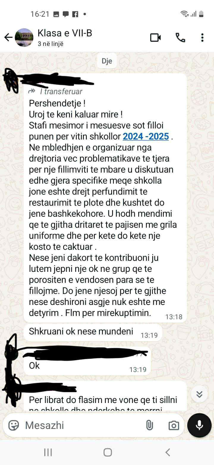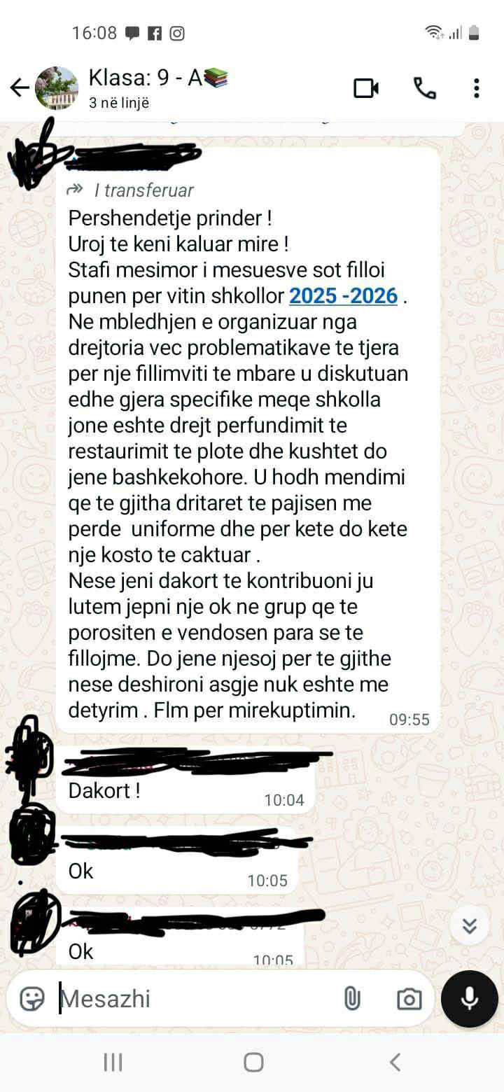 Sipas denoncimeve që kanë mbërritur nga qytetarët, drejtoria e shkollës dhe bashkia po kërkojnë që çdo prind të kontribuojë për të mbuluar këto kosto, edhe pse investimi për rikonstruksionin duhet të ishte përdorur edhe për këtë pjesë.