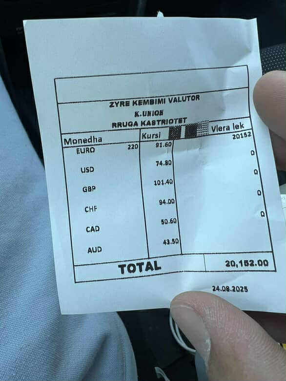 Ai ka treguar se përmes kësaj pike këmbimi i ka dërguar 220 euro një të afërmi, i cili i ka tërhequr paratë dje, më 27 gusht 2025. Por, siç tregon denoncuesi, në dokumentin e pagesës figuron data 24 dhe kursi i këmbimit i përdorur është 91.6 lekë për euro, ndërkohë që kursi zyrtar i Bankës së Shqipërisë ka qenë 96.8 lekë për euro.