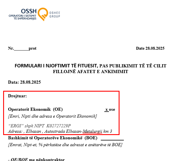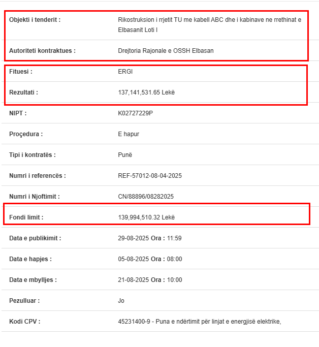 Një tjetër tender i majmë përfundon në duart e të njëjtëve emra. Drejtoria Rajonale e OSSH Elbasan, pjesë e OSHEE GROUP, ka shpallur fituese kompaninë ERGI shpk, në pronësi të Nuri Ballës, për rikonstruksionin e rrjetit TU me kabëll ABC dhe kabinave në rrethinat e Elbasanit.