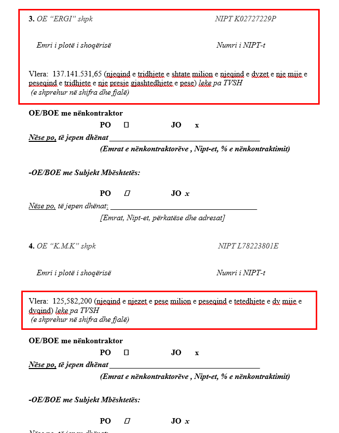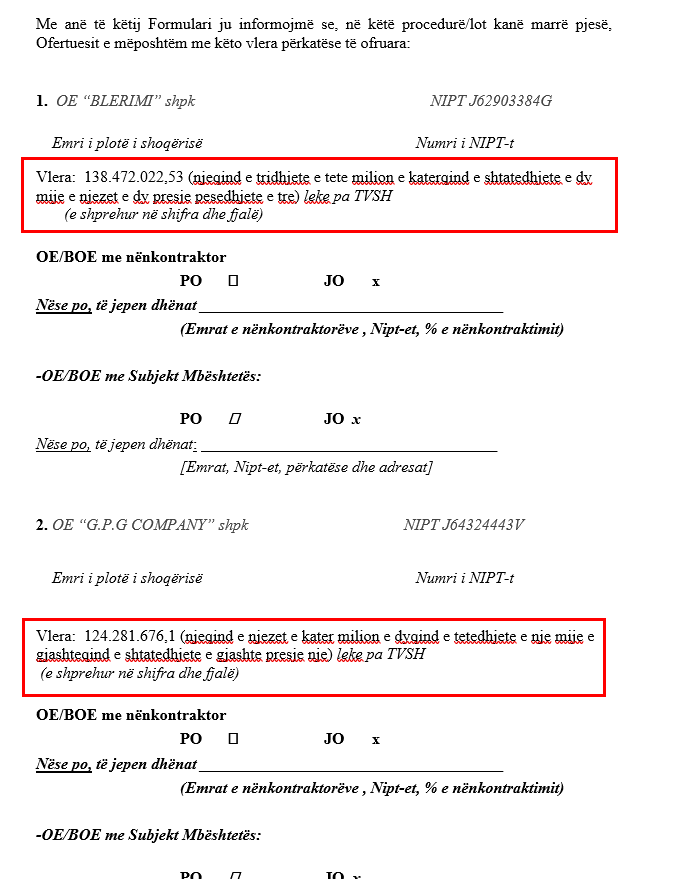 Nga dokumentet e siguruara nga JOQ Albania, vihet re se vlera fituese është pothuajse e barabartë me fondin limit të parashikuar, një praktikë tipike kur fituesi është i paracaktuar dhe gara shërben vetëm për sy e faqe.