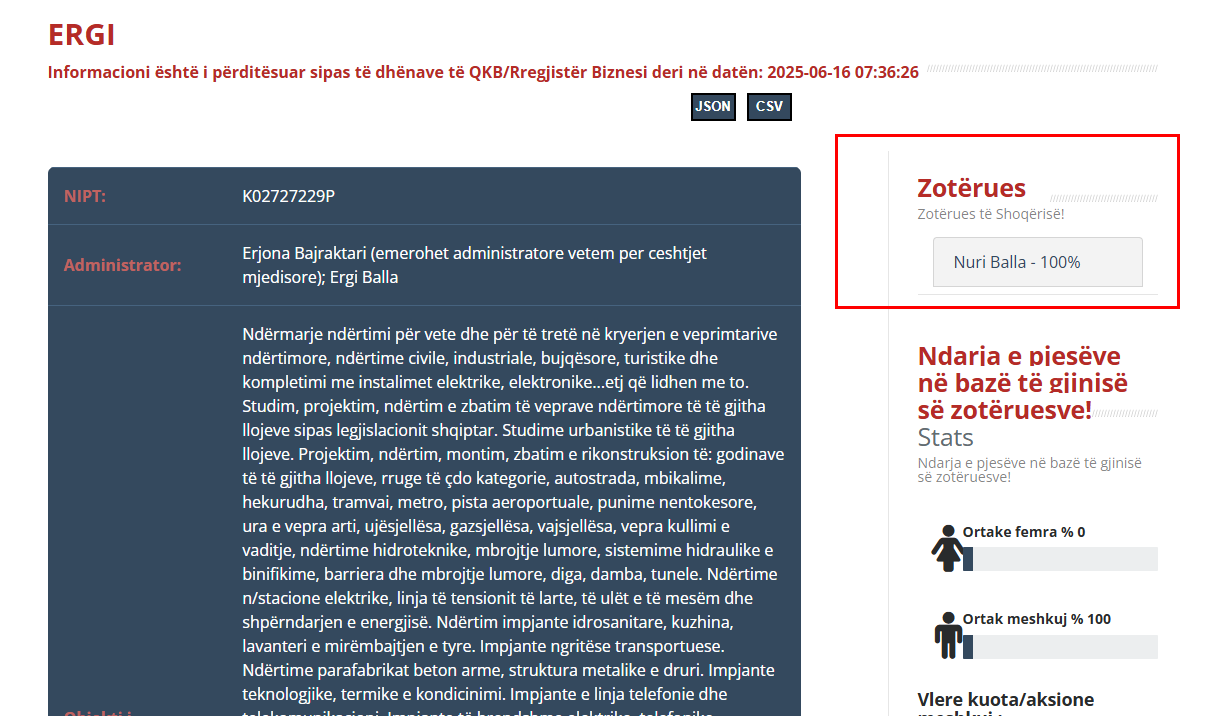 Pronari i “ERGI” shpk, Nuri Balla, nuk është emër i panjohur për drejtësinë dhe tenderat publikë. Në vitin 2017 ai ka qenë nën hetim nga Prokuroria e Elbasanit, si pjesë e një megaoperacioni për kontrollin e pasurive të 67 personave të lidhur me pushtetin lokal, mes tyre edhe të afërm të ish-kryebashkiakut Qazim Sejdini. Lista përfshinte biznesmenë të fuqishëm të Elbasanit, ku ndër ta ishte edhe Balla.