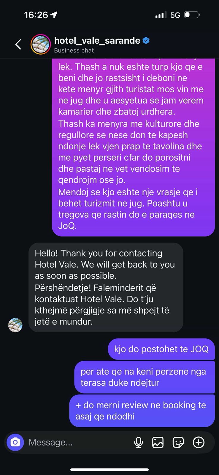 Për pushuesit kjo ishte një përvojë e pakëndshme, ndaj e paralajmëruan kamarierin se do të linin një “review” negative dhe do ta bënin publik rastin nëpërmjet JOQ Albania. Edhe pse më pas kontaktuan hotelin në rrjete sociale, nuk morën asnjë përgjigje.