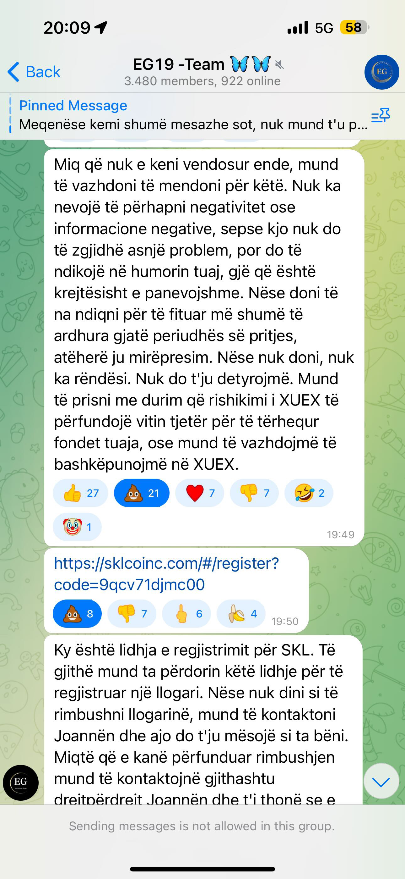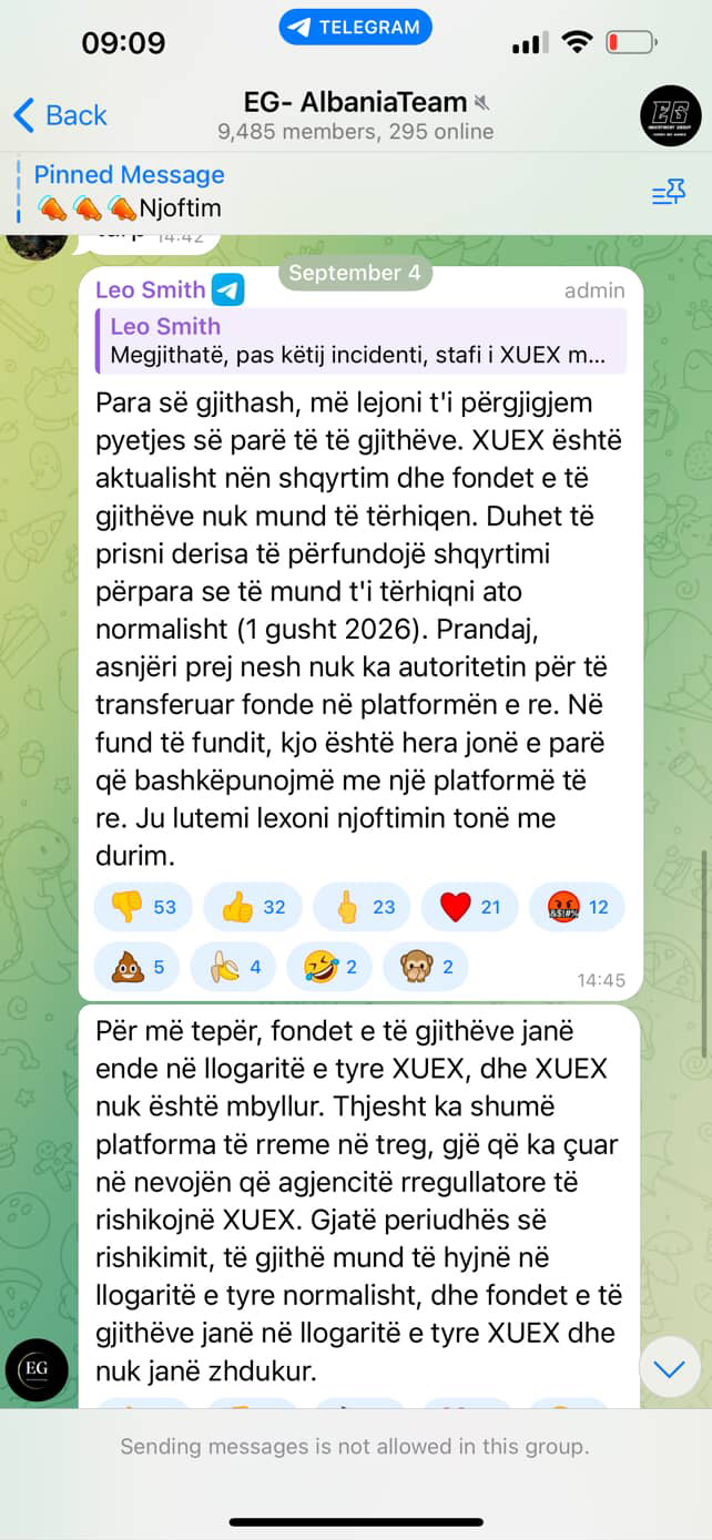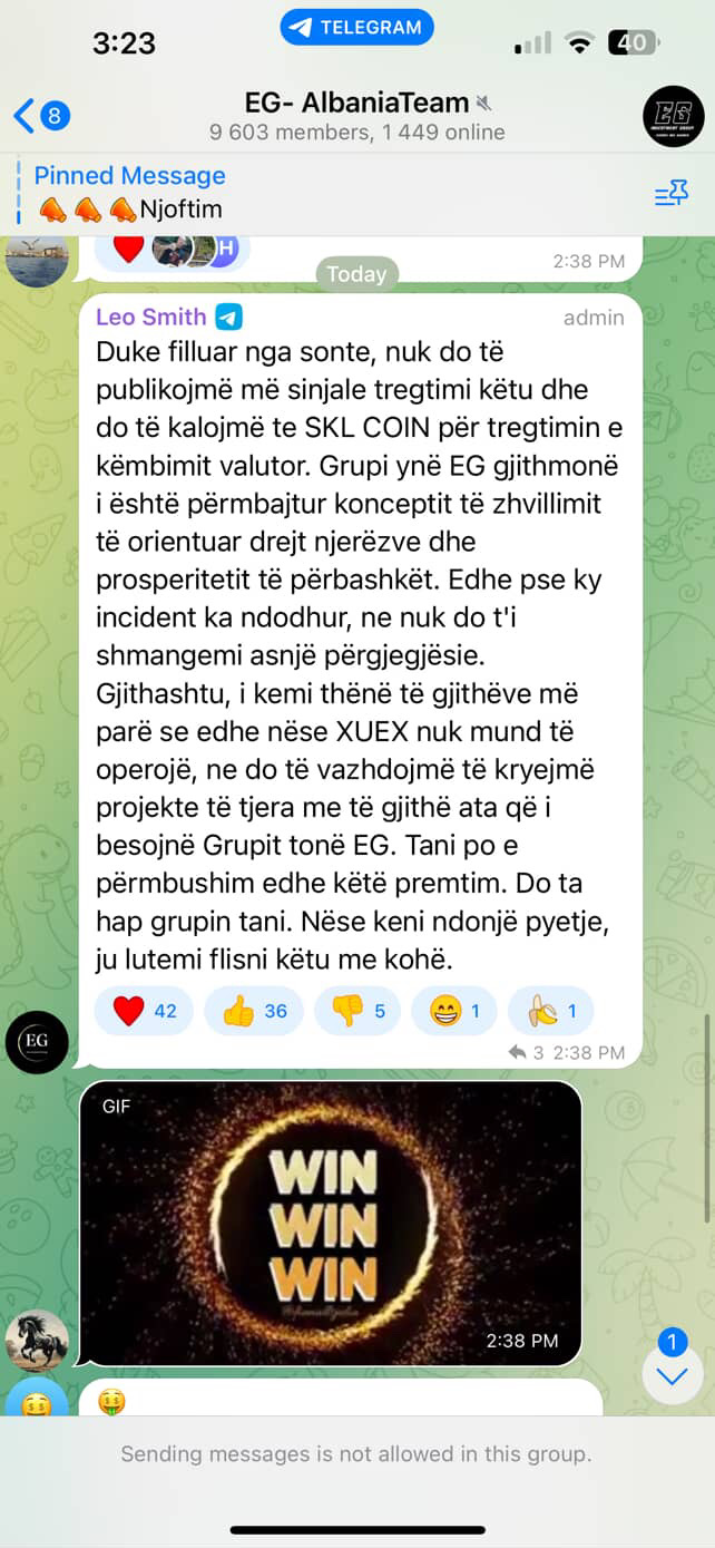 Pershendendetje ! Dua te ndaj nje shqetesim te madh per platformen xuex qe zhvati fondet e mijra shqiptareve ku nder to dhe mua. Bllokimi i parave duke penguar procesin e terheqjes nuk eshte i vetmi shqetesim. Sic mund ta shikoni dhe ne bisedat qe i ashtuquajturi “ Leo Smith “ vazhdon te mashtroj shqiptaret me pretekstin qe fondet mund te terhiqen pas 1 Gushtit 2026, jo vetem kaq zoteria ne fjal na paska menduar hapjen e nje platforme te re SKLCOIN dhe po perdor grupin ekzistues per te terhequr njerezit. Une per vete humba 3000 $ . Do ju lutesha njerezve te ken kujdes!