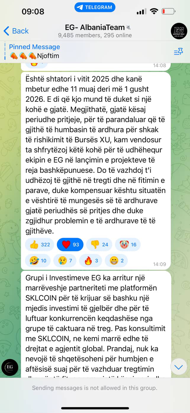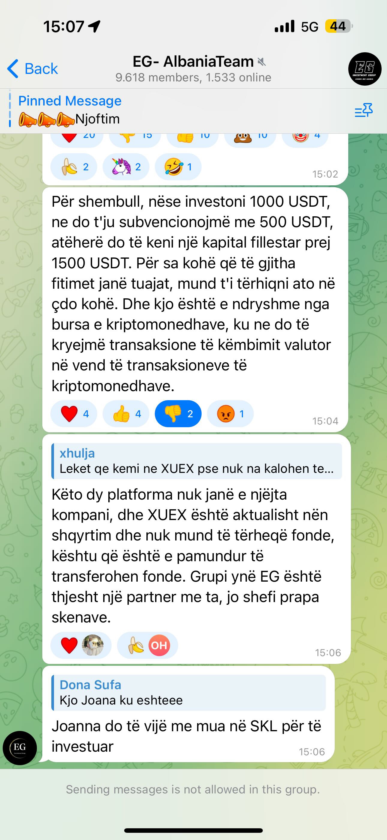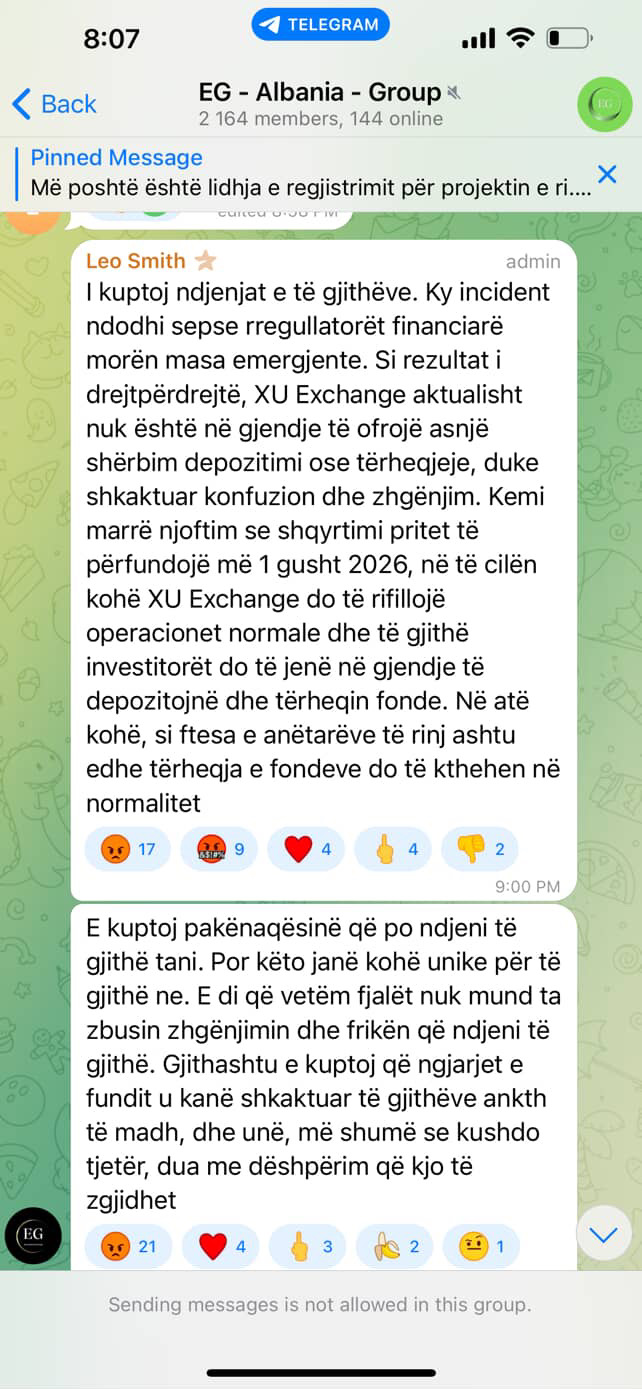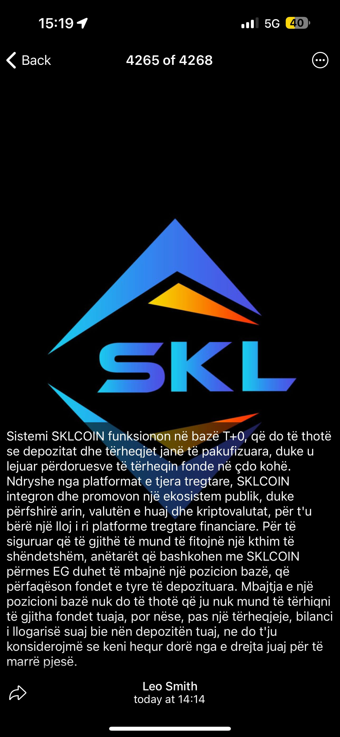 Pershendendetje ! Dua te ndaj nje shqetesim te madh per platformen xuex qe zhvati fondet e mijra shqiptareve ku nder to dhe mua. Bllokimi i parave duke penguar procesin e terheqjes nuk eshte i vetmi shqetesim. Sic mund ta shikoni dhe ne bisedat qe i ashtuquajturi “ Leo Smith “ vazhdon te mashtroj shqiptaret me pretekstin qe fondet mund te terhiqen pas 1 Gushtit 2026, jo vetem kaq zoteria ne fjal na paska menduar hapjen e nje platforme te re SKLCOIN dhe po perdor grupin ekzistues per te terhequr njerezit. Une per vete humba 3000 $ . Do ju lutesha njerezve te ken kujdes!
