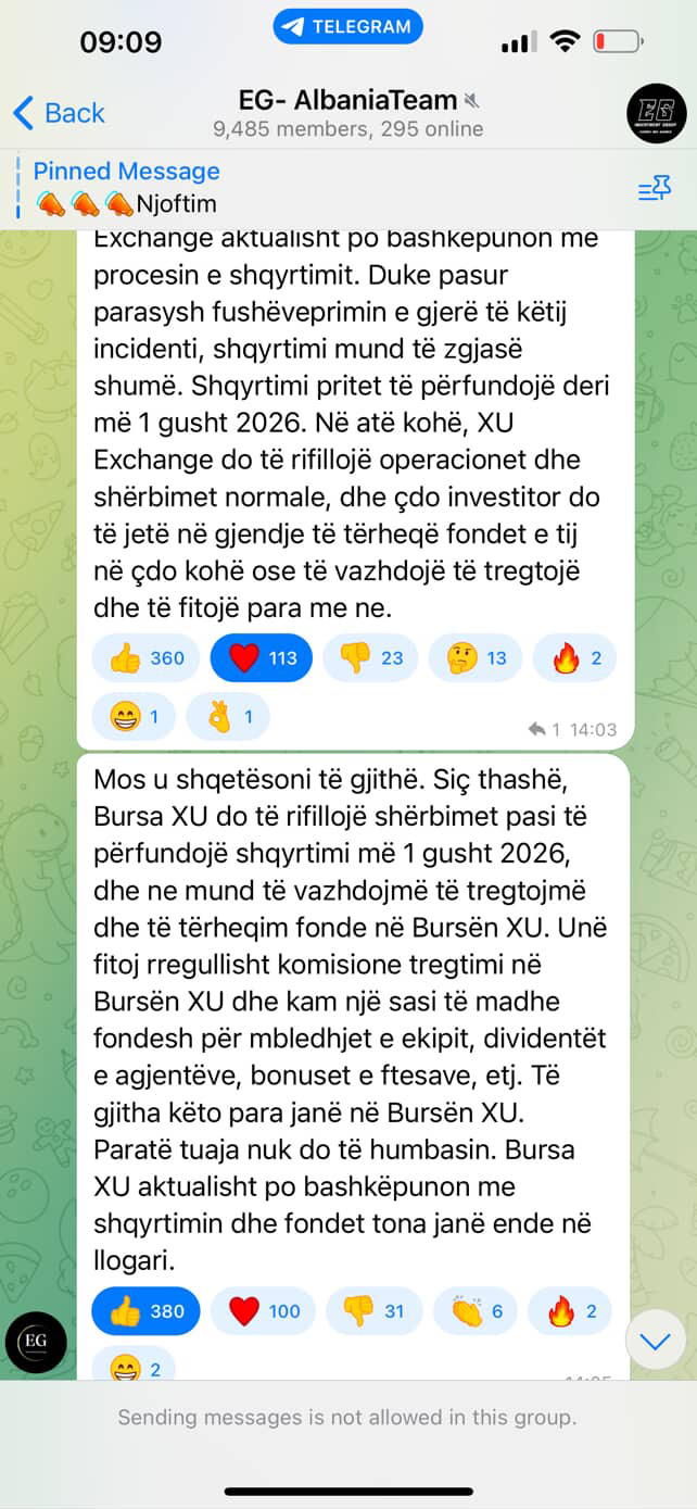 Joq mund te flasim rreth platformes xuex se jam nje anetar i xuex sot u mbyll na mashtruan te gjitheve iken paret ca patem llogari por me keqa eshte po dun te na mashtrojne me nje platforme te re. Te kjo SKL thot te investojme. te lutem publikoje beje publike kete platformen e re mos mashtrohen prap sic jemi mashtruar ne 15 mi veta te xuex. Te gjitha bisedat i ke ketu ku kerkon 1000 usd per tu futur te platforma re ne kaq prova kemi se sna lejonte me shume