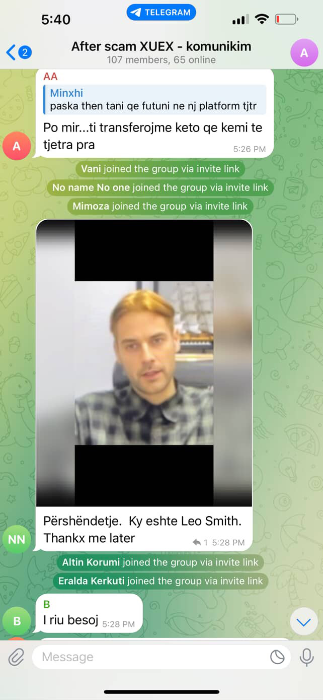 Pershendetje Dua tju dergo foto te disa bisedave te “profesorit” Te mashtrimit Xuex Exchange dhe EG Group. Ju keni bere nje artikull per kete temë. “Profesori” i thone Eshte Anthony Leo Smith, nese eshte u vertete. Sapo ka bllokuar te gjitha fondrt e Xuex Exchange dhe madje kerkon qe te investojme ne Platformen e re sepse Xuex eshte nen hetim deri ne Gusht 2026