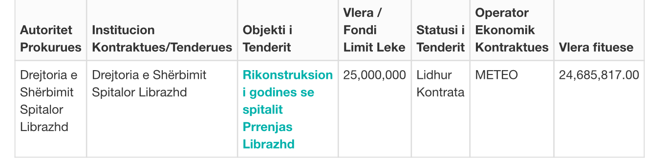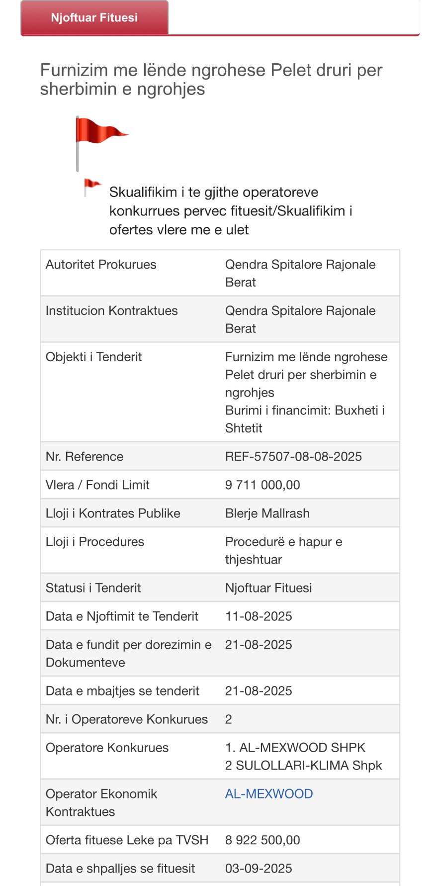 Kompania AL-MEXWOOD shpk në pronësi të Eral Myftarajt u shpall fituese teksa oferta më e ulët u skualifikua. Tenderi u shënua me Flamur të Kuq për shkelje të ligjit të Prokurimeve Publike në dy pika.