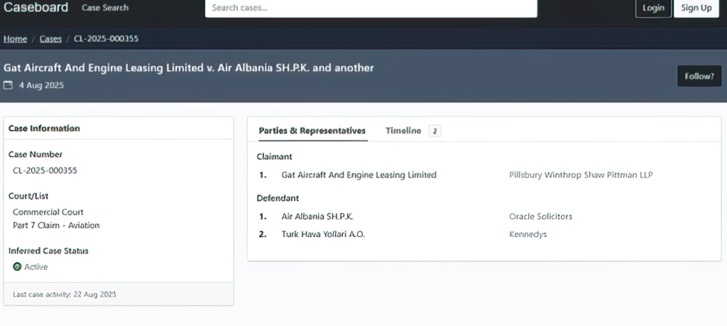 Padia u depozitua në gjykatën britanike më 1 gusht dhe përfshin akuzat për shkelje të detyrimeve të tjera, përfshirë ato ndaj Eurocontrol, dhe për mosridërgimin e avionëve. GA Telesis kërkon që të ndalohen operacionet e mëtejshme të avionëve dhe të detyrohet Air Albania të ridërgojë avionët dhe të paguajë borxhet e prapambetura.