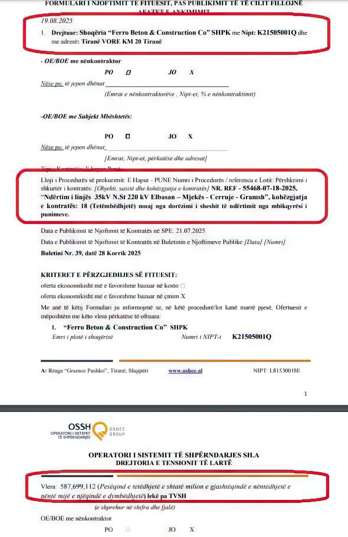 Në fillim të gushtit, Drejtoria e Tensionit të Lartë, strukturë në varësi të OSSH, ka shpallur fituese kompaninë “Ferro Beton & Construction Co” në një procedurë të zhvilluar me ritëm “urgjent”, duke vënë në lojë një fond prej rreth 6 milionë eurosh. Tenderi me fond limit 599.9 milionë lekë u hap me një afat vetëm dyjavor, duke mbyllur garën në 5 korrik.