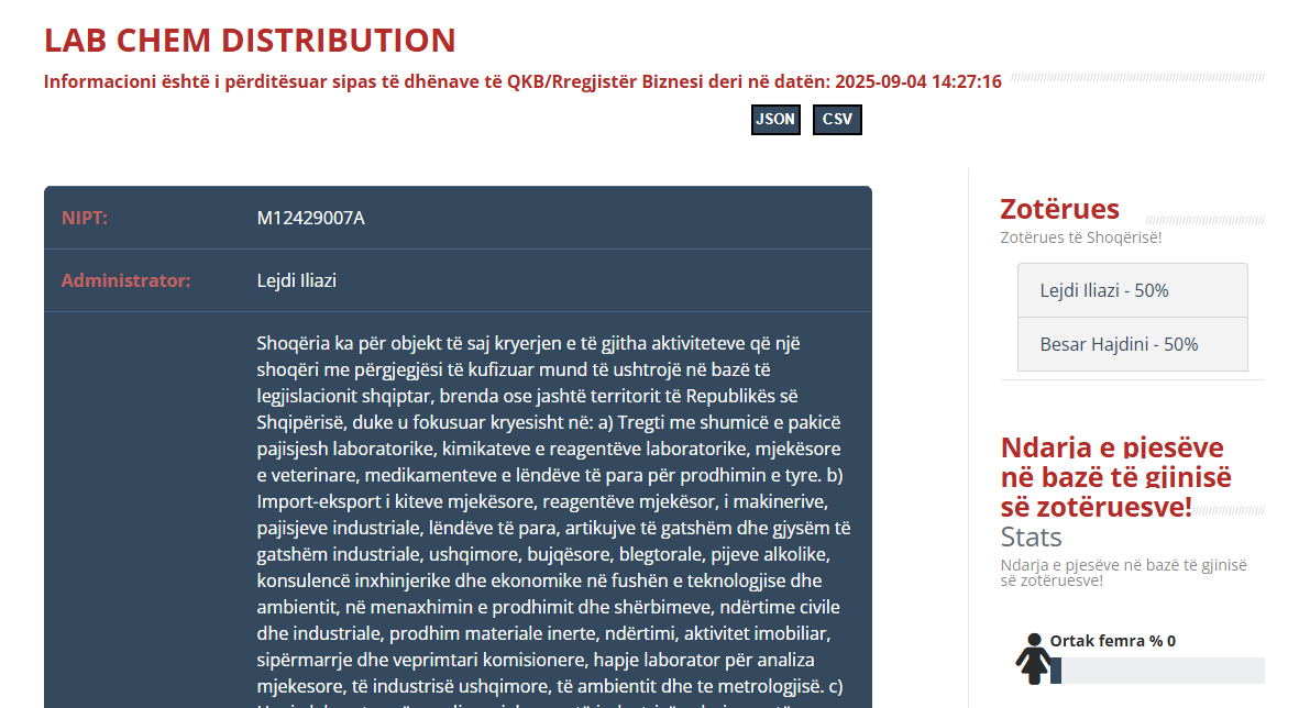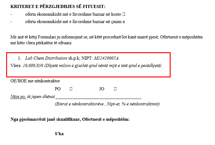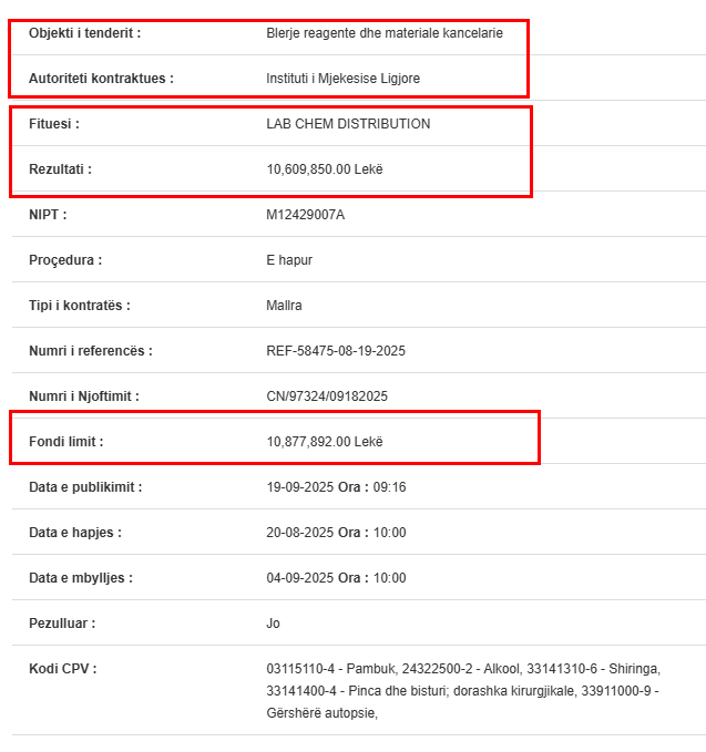 Një tjetër skandal ka dalë në dritë në Institutin e Mjekësisë Ligjore, ku tenderi për blerje reagentesh dhe materialeve të kancelarisë duket se është kthyer në një mënyrë për pasurim të paligjshëm. Tenderi shpalli fituese firmën LAB CHEM DISTRIBUTION, në pronësi të Lejdi Iliazit dhe Besar Hajdinit (50% secili), me një vlerë prej 10,609,850 lekë të reja pa TVSH, pra rreth 130 milionë lekë të vjetra me TVSH, ose 97.5% e fondit limit, i cili ishte 10,877,892 lekë të reja pa TVSH.