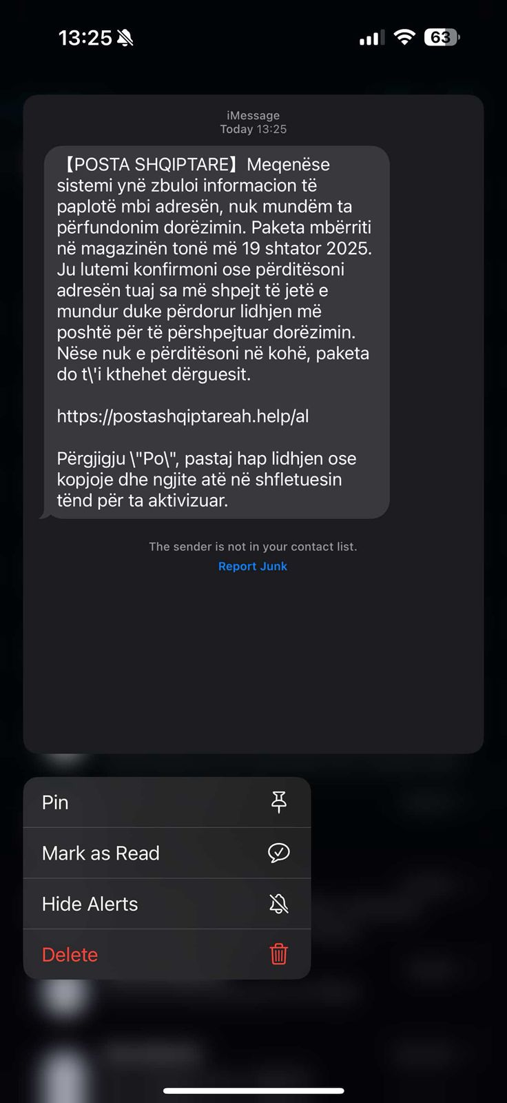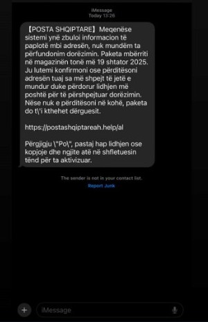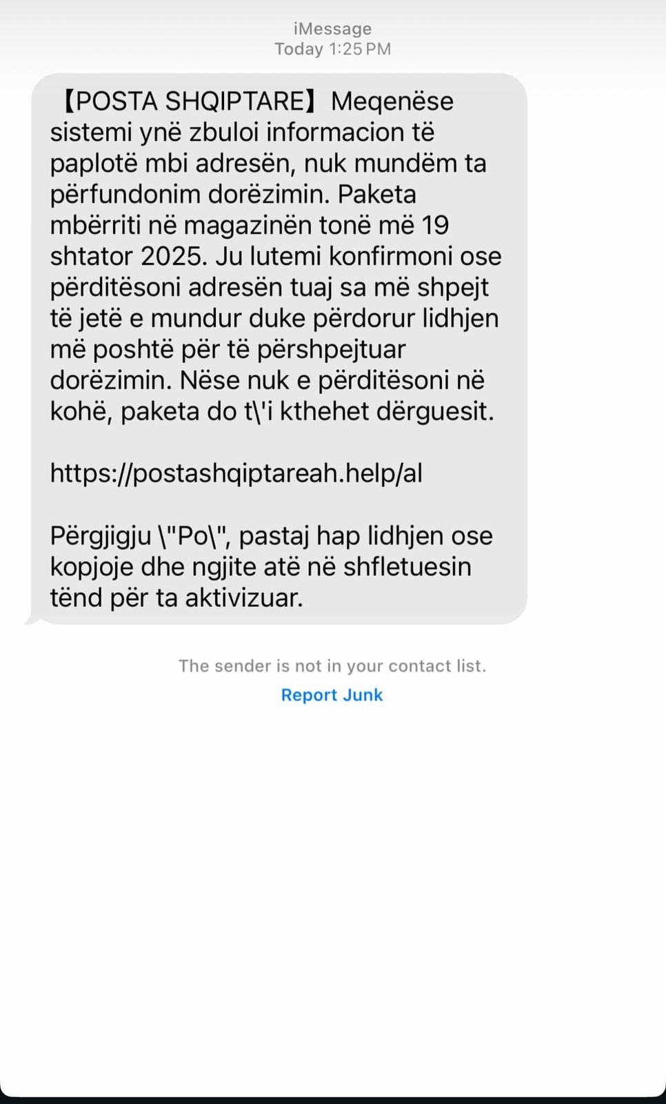 Në mesazh thuhet: “[POSTA SHQIPTARE) Meqnese sistemi yne zbuloi informacion te paplote mbi adresen, nuk mundem ta perfundonim dorezimin. Paketa mbërriti ne magazinen tone me 19 shtator 2025.