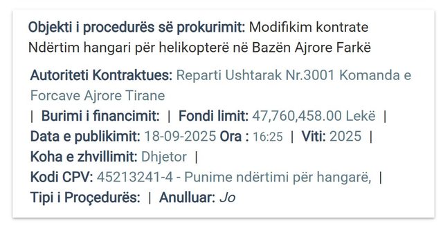 Por, pas përurimeve dhe festimeve, vjen surpriza: Komanda e Forcave Ajrore ka hapur procedurën e re me objekt “modifikim kontrate ndërtim hangari për helikopterë në Bazën Ajrore Farkë”. Fondi limit i kësaj shtese është plot 47,760,458 lekë, ose rreth 500 mijë euro të tjera.
