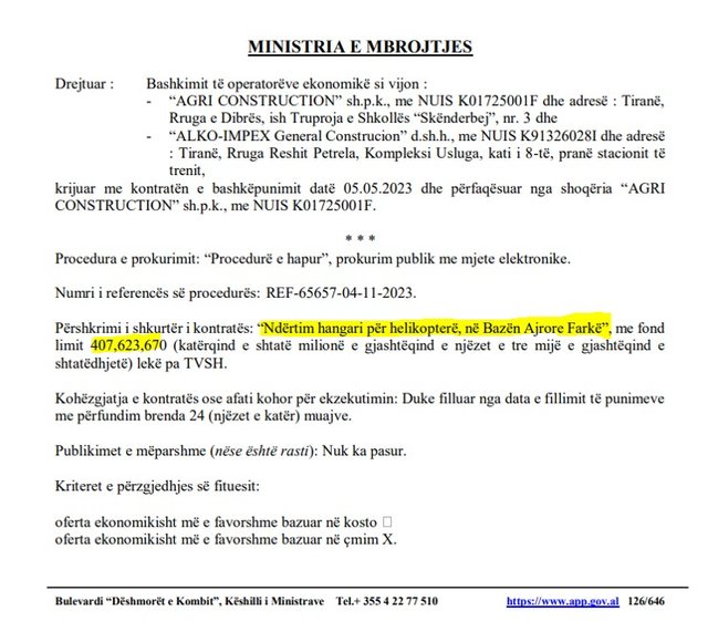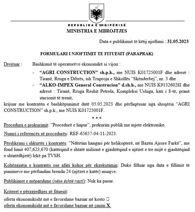 Dokumentet zyrtare tregojnë se tenderin e vitit 2023 e fituan kompanitë “AGRI Construction” dhe “ALKO-IMPEX General Construction”, pas skualifikimit të 8 operatorëve të tjerë nga gara. Shuma e parë e kontratës shkonte në afro 5 milionë euro, ndërsa tani kostoja totale i afrohet 5.5 milionë eurove.