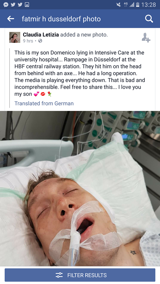 Ky është djali im Domenico i shtrirë në kujdesin intensiv në spitalin universitar. Sul në Dusseldorf në një stacion hekurudhor qëndror. Ata e goditën në kokë me një sëpatë. Ai pati një operacion të gjatë. Media po hedh gjithçka poshtë. Kjo është gjë e keqe dhe e pakuptueshme. Ndjehuni të lirë për ta shpërndarë këtë foto. Të dua biri im", shkruan e ëma e Domenicos, i cili u godit me sëpatë mbrëmë nga shqiptari nga Kosova.