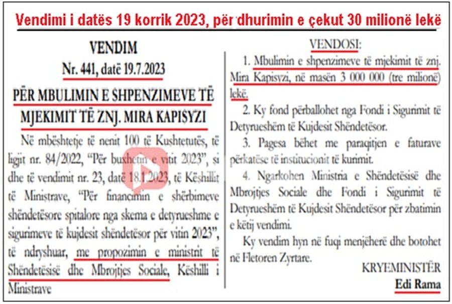 Më 25 shtator 2025, është firmosur Vendimi nr. 538, duke i akorduar 50 milionë lekë nga taksat e shqiptarëve ish-zv/ministres së Shëndetësisë, Mira Kapisyzi-Rakacolli, për një “trajtim shëndetësor jashtë vendit”.
