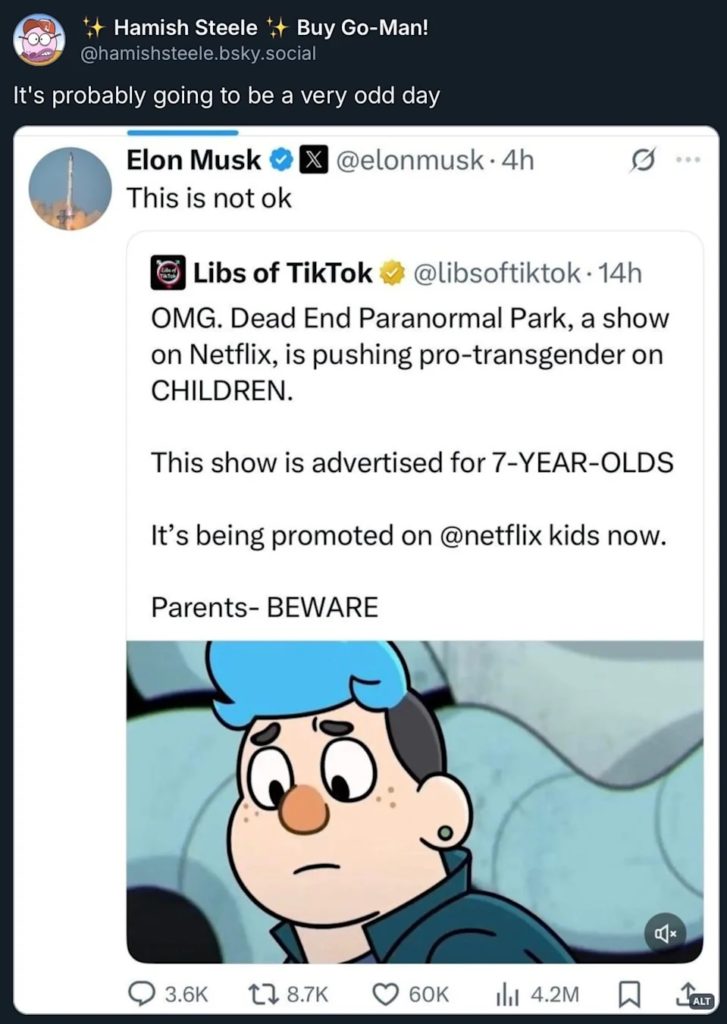 Në qendër të diskutimit ndodhet seriali i animuar “Dead End: Paranormal Park”, i cili paraqet personazhe nga komuniteti LGBTQ+, mes tyre edhe një protagonist transgjinor. Polemikat shpërthyen pasi në rrjetet sociale qarkulloi një skenë nga seriali, e shpërndarë fillimisht nga faqja konservatore Libs of TikTok, duke ndezur reagime të forta nga grupet konservatore.