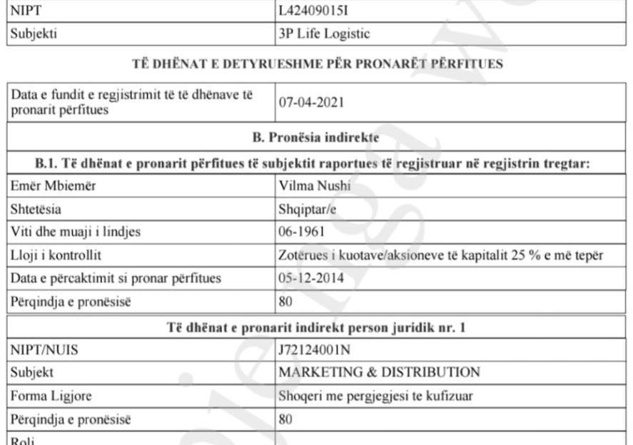 Sipas të dhënave hetimore, Nushi ka kaluar shuma të mëdha në llogaritë e “Victoria Construction” në vitin 2018, vetëm një vit para se qeveria Rama të miratonte lejen e ndërtimit për kullën. Fillimisht 1 milion euro dhe më pas mbi 2 milionë euro të tjera kanë kaluar përmes kompanisë së saj Marketing & Distribution, që është edhe zotëruesja kryesore e koncesionarit 3P Life Logistic.