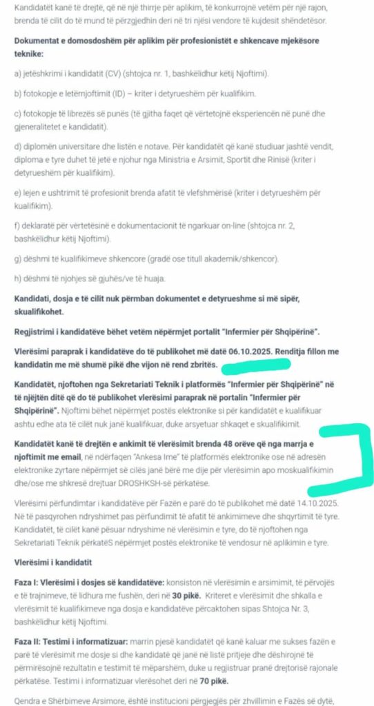 Përshëndetje JOQ, platforma "Infermier për Shqipërinë" është duke u tallur me ne infermierët... Në njoftim thuhet se lista paraprake me emrat e fituesve duhej të publikohej në datë 6.10.2025, sot datë 9.10.2025 ende nuk kemi listë të afishuar... Lë shumë për të dëshiruar edhe mënyra e përllogaritjes së pikëve, ku bëjnë burokraci të paparë, duke ngritur sa më shumë pikë atij që e ka paracaktuar të zërë vendin me mik, edhe duke ulur pikët dikujt që e ka konkurrimin me shumë mundim e ndershmëri... Dhe kur dërgohen email-e drejtuar DROSHKSH e kërkojmë sqarim, nuk kthejnë përgjigje nga DROSHKSH... Sepse ky vend drejtohet nga kalbësira të sistemit që ata pak infermierë që janë ende këtu duan t’i largojnë për të uzurpuar postet analfabetët me miq dhe lekë shumë. E keni të faktuar thirrjen me datën e përcaktuar por nuk është bërë asnjë shpallje e listës me pikët e dosjes. Në njoftim thuhet datë 6.10.2025, mund t’ju dërgoj edhe link-un e platformës "Infermier për Shqipërinë" që s’ka asnjë publikim liste dosjeje. Këto janë listat ekzistuese emërore, portali i vjetër. Lista e re me pikët e dosjeve që duhej shpallur nuk është publikuar ende. Urdhëroni me fakte që të gjithë po presim listën me pikët e dosjes dhe s’ka asnjë publikim deri tani.