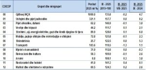 Indeksi i tërësishëm i harmonizuar i çmimeve të konsumit pësoi rënie në një mesatare prej -0.2% në muajin shtator 2025 krahasuar me muajin gusht 2025, si rezultat i rënies së çmimeve të konsumit te nëngrupet e COICOP-it: karburantet dhe lubrifikantët për pajisjet e transportit personal (-3.6%), pemët (-2.8%), biletat e fluturimeve (-1.6%), energjia elektrike (-1.2%) me një ndikim të përbashkët të këtyre nëngrupeve prej -0,4 për qind në IHÇK.