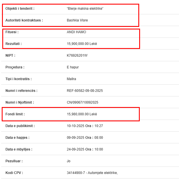 Objekti i procedurës është “Blerje makina elektrike”, me numër reference REF-60582-09-08-2025 dhe një fond limit prej 15,980,000 lekësh të reja pa TVSH, ose rreth 191 milionë lekë të vjetra me TVSH.