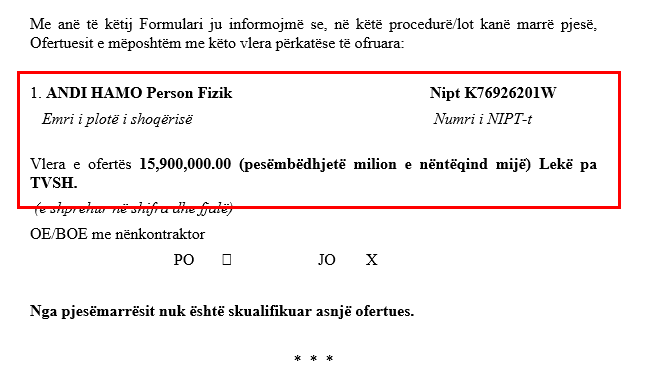 Fitues është shpallur Andi Hamo, me ofertën 15,900,000 lekë pa TVSH — pra vetëm 0.5% më pak se fondi limit, një diferencë simbolike që në praktikë sinjalizon një tender të paracaktuar.