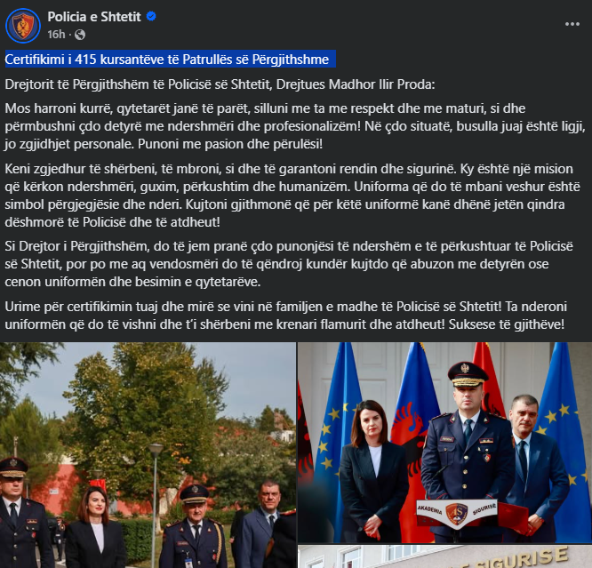 Policia e Shtetit ka njoftuar zyrtarisht se 415 kursantë janë certifikuar për Patrullë të Përgjithshme në praninë e Ministres së Brendshme Albana Koçiu, Drejtorit të Përgjithshëm të Policisë, Ilir Proda, dhe krerëve të tjerë të institucioneve të sigurisë.
