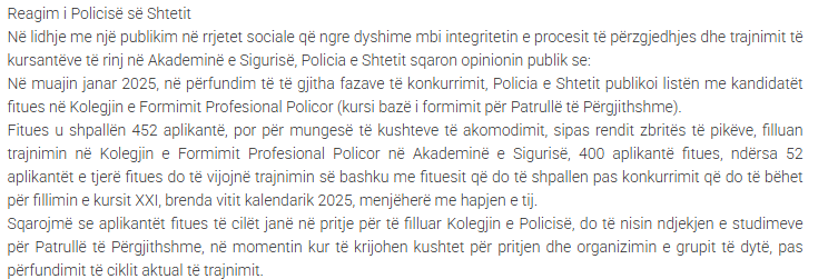 Deri më tani janë quajtur "zëra", por duket se këto shqetësime mund të kenë pasur bazë. Si punonjës të Policisë së Shtetit, kërkojmë transparencë dhe barazi për të gjithë kandidatët dhe kursantët, dhe shpresojmë që ky shqetësim të merret seriozisht nga autoritetet përkatëse. Ju falenderoj për vëmendjen dhe mbështetjen ndaj çështjeve që prekin integritetin dhe besimin ndaj institucioneve tona.