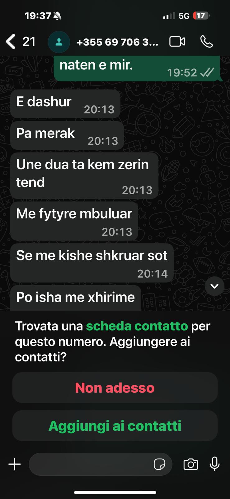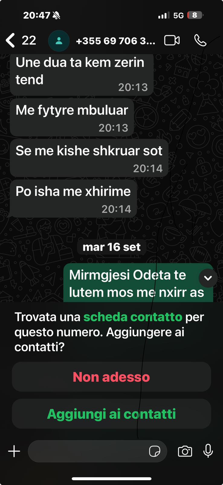 Odeta më premtoi që s’do ta bënte publike kurrë. Kam mesazhet që kemi rënë dakord. Në Gusht Odeta Dume më merr me video-kamer në WhatsApp ku më thotë “Rregullojë kamerën”, kështu-ashtu, procedura që nuk i njihja.