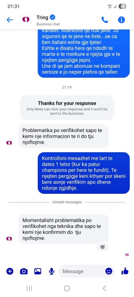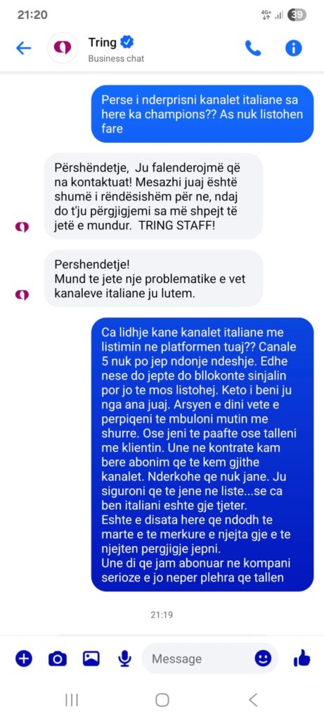 Përshëndetje JOQ! Një pyetje ndjekësve ju lutem, nëse kanë të njëjtin problem me platformën Tring... Çdo të martë dhe të mërkurë (kur ka ndeshje të Champions League) ndërpresin kanalet italiane duke i hequr fare nga listimi. (Mund ta verifikoni momentalisht). Kur merr shërbimin e klientit, justifikohen që e kanë problemin vetë kanalet italiane... Ndërkohë që këto të fundit nuk japin ndonjë ndeshje që të mendosh se mund të lidhet me të drejtat televizive. Edhe nëse do ishte kështu, kanali do ndërpriste sinjalin apo transmetimin, por jo të hiqej vetë nga platforma. D.m.th heqjen nga lista e bën Tring për arsye që vetëm ata e dinë, por pa dhënë asnjë shpjegim për klientin, ndërkohë që ne paguajmë abonimin e plotë për të gjitha kanalet që supozohet të jenë të përfshira. Përgjigja e zakonshme është vetëm që do verifikohet. Kuptohet, sa për të kaluar situatën.