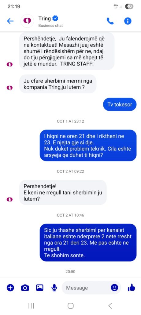 Sipas denoncuesit, kontakti me shërbimin ndaj klientit nuk sjell ndonjë zgjidhje konkrete, pasi përgjigjja standarde është se “problemi është nga vetë kanalet italiane” dhe se “do verifikohet”. Por ajo që i bën qytetarët edhe më konfuzë është fakti që kanalet nuk bllokohen apo ndërpresin sinjalin, por hiqen krejtësisht nga lista, gjë që, sipas tyre, bëhet qëllimisht nga vetë Tring.