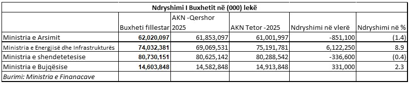 Qeveria shqiptare ka miratuar për herë të tretë këtë vit një rishikim të buxhetit të shtetit, duke bërë ndryshime të ndjeshme në shpërndarjen e fondeve. Sektori i arsimit dhe ai i shëndetësisë janë prekur nga shkurtimet, ndërsa infrastruktura ka përfituar rritje të konsiderueshme. Ministrisë së Arsimit i janë hequr rreth 851 milionë lekë krahasuar me qershorin, çka e çon uljen totale në mbi 1 miliard lekë më pak se buxheti fillestar i vitit 2025.