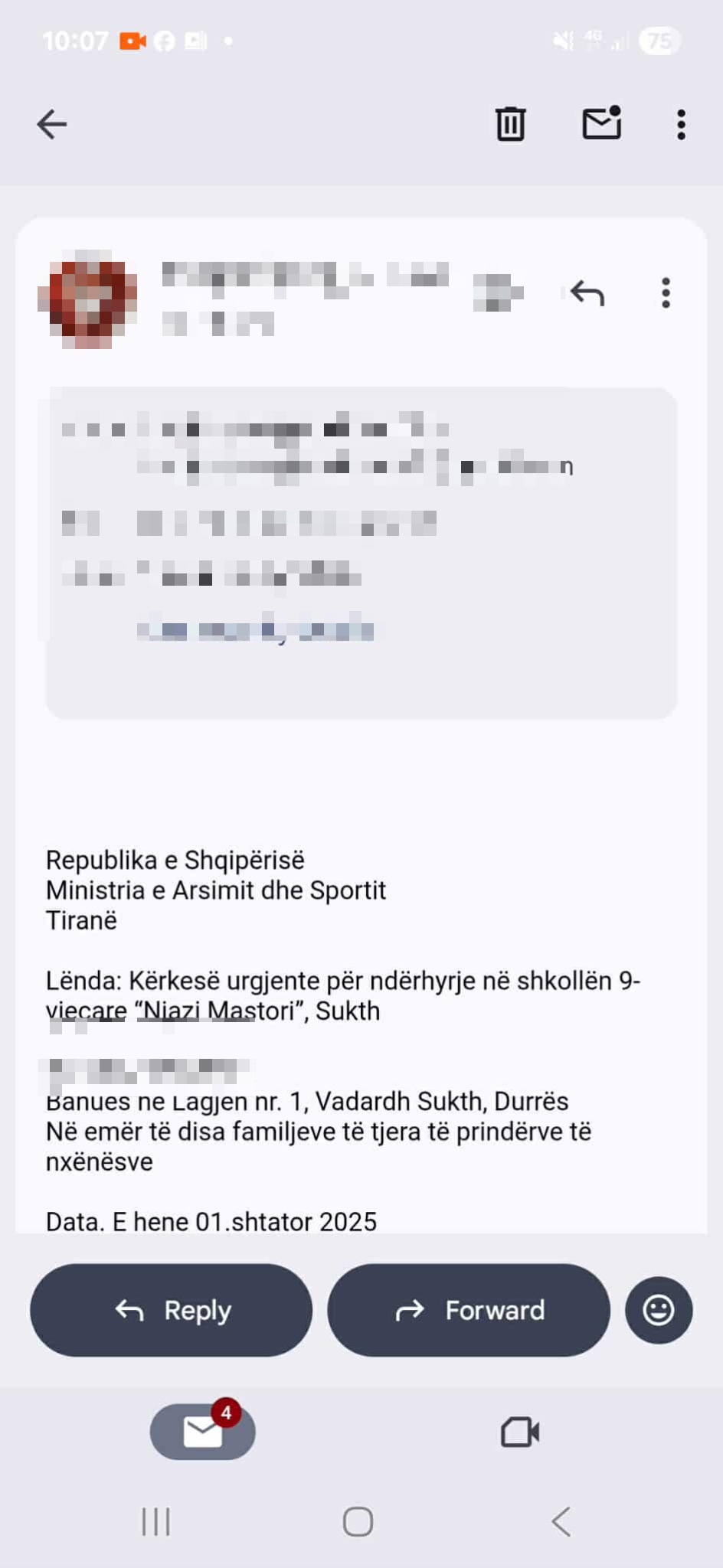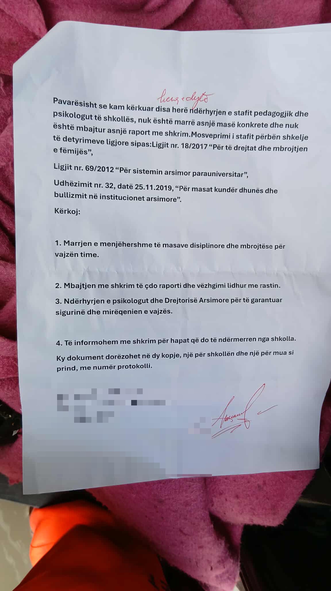 Më 7 qershor, prindi shprehet se ka dorëzuar një ankesë zyrtare në Ministrinë e Arsimit, duke kërkuar ndërhyrje për të ndalur situatën, por deri më tani nuk ka marrë asnjë përgjigje apo veprim konkret.