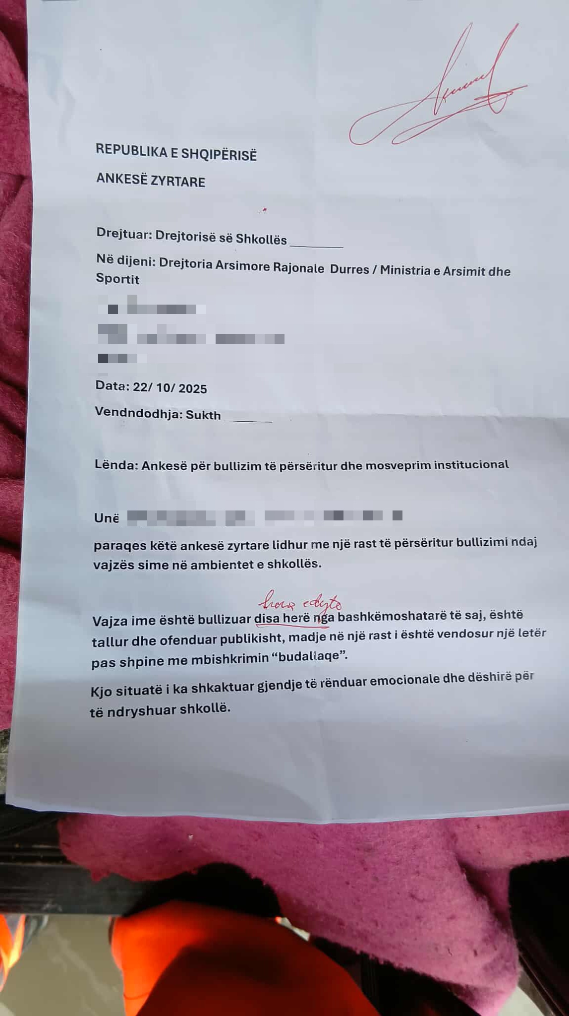 “Jam prind i një vajze që ndjek shkollen Njazi mastori Sukth Vajza ime është viktimë e bullizmit të përsëritur nga bashkëmoshatarët e saj. Ajo ka ardhur në shtëpi disa herë duke qarë, duke thënë se e kanë fyer, e kanë tallur dhe madje i kanë vendosur fletë me fjalë fyese pas shpine.