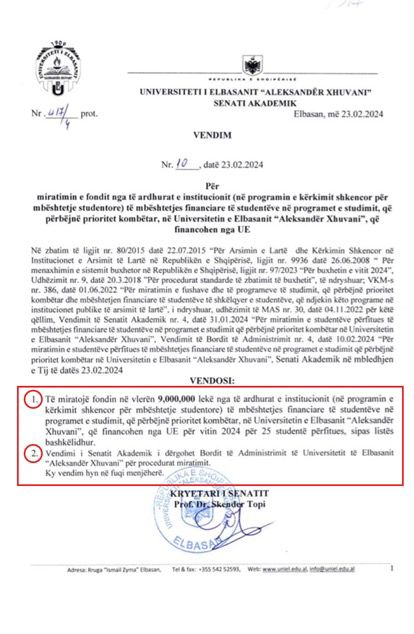 Një grup studentësh të Universitetit “Aleksandër Xhuvani” në Elbasan denoncojnë mungesë të plotë transparence nga ana e institucioneve akademike, pasi sipas tyre, fondet e miratuara për mbështetje financiare nuk janë shpërndarë tek përfituesit. Sipas Vendimit nr. 10, datë 23.02.2024, të firmosur nga rektori Prof. Dr. Skënder Topi, ishte miratuar një fond prej 9,000,000 lekësh për 25 studentë të degëve prioritare. Megjithatë, më shumë se një vit pas këtij vendimi, studentët thonë se nuk kanë marrë asnjë pagesë dhe nuk kanë marrë asnjë shpjegim nga universiteti për vonesat apo fatin e fondeve.