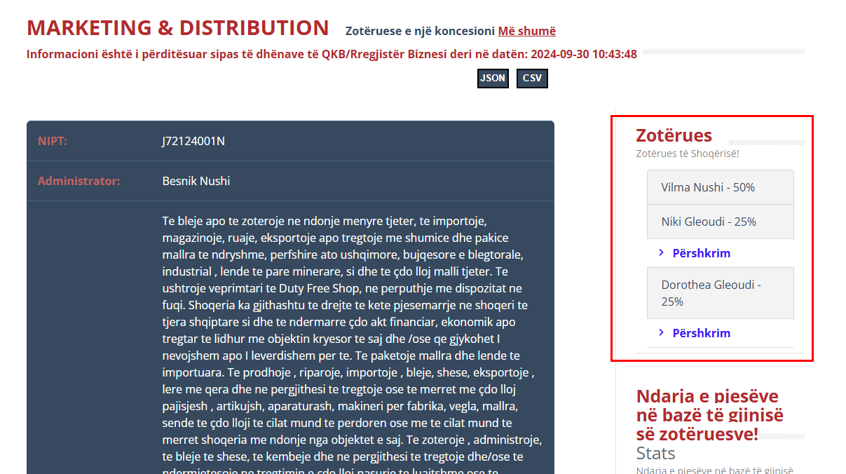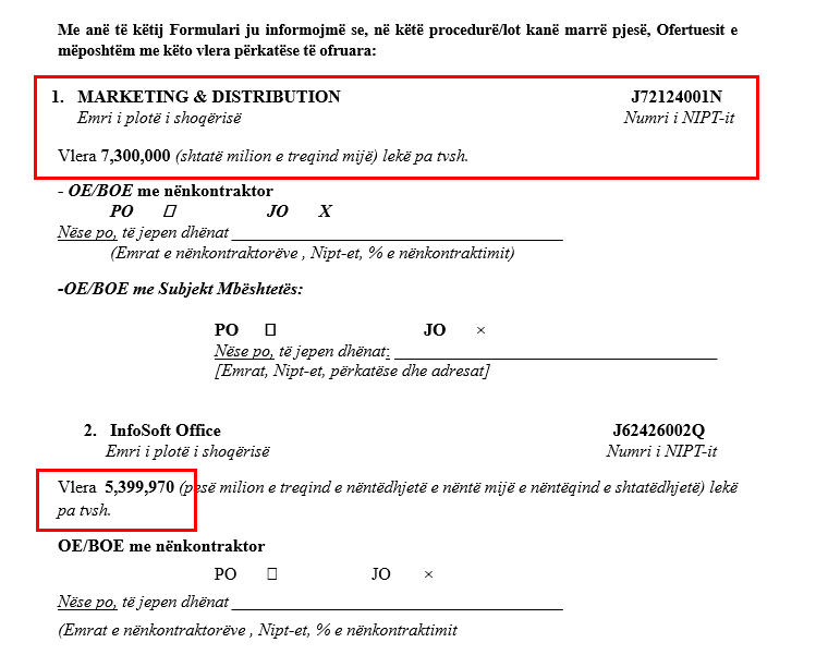 Fitues është shpallur kompania “Marketing & Distribution”, në pronësi të Vilma Nushit, Niki Gleoudit dhe Dorothea Gleoudit, me ofertë 7,300,000 lekë të reja pa TVSH ose rreth 88 milionë lekë të vjetra me TVSH. Pra vlera fituese rezulton të jetë 98.4% e fondit limit. Një vlerë pothuaj identike me maksimumin e lejuar, që në praktikë tregon mungesë gare reale.