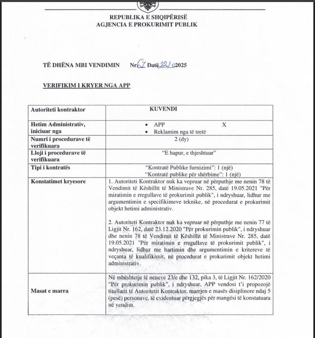 APP-ja ka propozuar marrjen e masave disiplinore ndaj pesë punonjësve të Kuvendit, të cilët janë identifikuar si përgjegjës për shkeljet, ndërsa vendimi final mbetet tek drejtuesi aktual i Kuvendit, Niko Peleshi. Hetimi lidhet me kohën kur Kuvendi drejtohej nga Elisa Spiropali, aktualisht Ministre e Jashtme. Shkeljet lidhen me menaxhimin e tenderave gjatë periudhës së saj. Punonjësit e përfshirë janë ende në detyrë, ndërsa Peleshi duhet të vendosë nëse do të ndërmarrë masa disiplinore ose do t’i referojë çështjet në SPAK apo Prokurorinë e Tiranës.