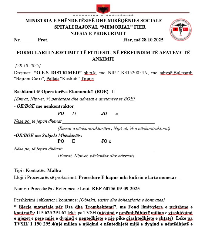 Një tjetër tender me aromë abuzimi duket se ka kaluar “pa zhurmë” në Spitalin Rajonal “Memorial” të Fierit. Bëhet fjalë për procedurën me objekt “Blerje materiale për DSA dhe Trombektomi”, me numër reference REF-60756-09-09-2025, me një fond limit prej 115,625,291.67 lekësh pa TVSH, ose rreth 1.4 miliardë lekë të vjetra me TVSH.