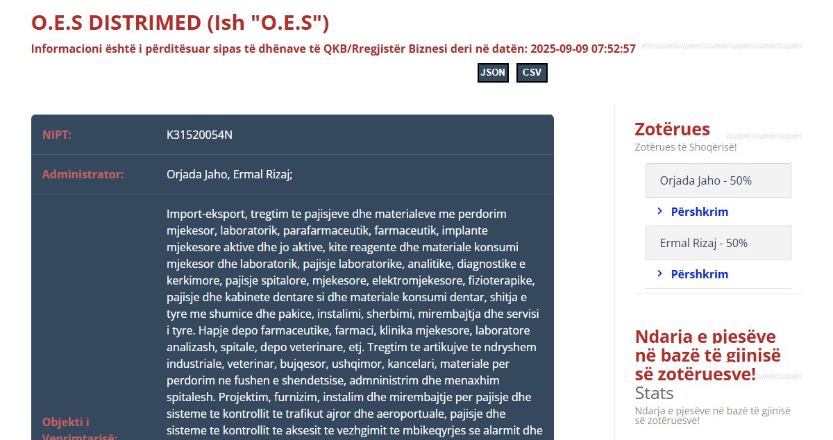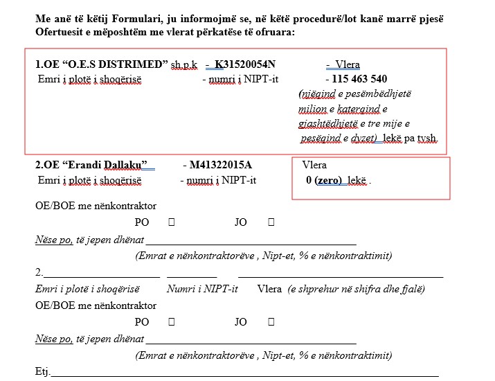 Fitues i shpallur është “O.E.S Distrimed”, kompani në pronësi të Orjada Jaho dhe Ermal Rizaj, e cila ka ofruar një vlerë prej 115,463,540 lekësh pa TVSH. Kjo përbën 99.86% të fondit limit, një shifër që ngre serioze dyshime për mungesë gare reale dhe për një fitues të mundshëm të paracaktuar.