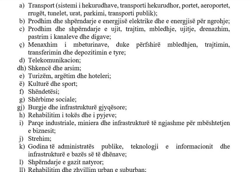 Sipas dokumentit, lista e shërbimeve të mundshme për koncesion është ka përfshirë “ndriçimin publik në territorin e njësive administrative vendore; bujqësi dhe kontrata të tjera në sektorët utilitarë”.
