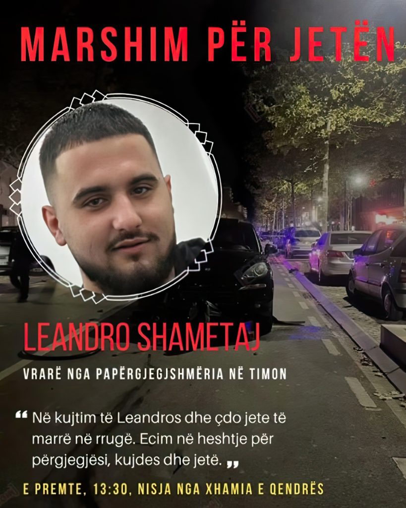Soy, më 31 tetor, në orën 13:30, qytetarët e Vlorës do të marrin pjesë në një marshim paqësor në kujtim të 17-vjeçarit Leandro Shametaj, i cili humbi jetën tragjikisht disa ditë më parë në një aksident rrugor. Nisma, e quajtur “Marshim për Jetën”, do të nisë nga Xhamia e Qendrës dhe do të përfundojë në bulevardin “Ismail Qemali” në Vlorë, në vendin ku ndodhi përplasja fatale. Marshimi organizohet nga nëna e të ndjerit dhe synon të përcjellë një mesazh të fortë kundër drejtimit të automjeteve nën efektin e alkoolit dhe shpejtësisë së lartë, duke kërkuar më shumë kujdes dhe përgjegjësi në rrugë.