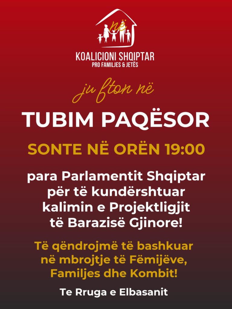 Sonte në orën 19:00, para Parlamentit Shqiptar në Rrugën e Elbasanit, Koalicioni Shqiptar Pro Familjes & Jetës do të organizojë një tubim paqësor për të kundërshtuar kalimin e Projektligjit për Barazinë Gjinore. Organizatorët i kanë ftuar qytetarët të vishen me të zeza, duke e konsideruar këtë si një simbol zie kombëtare për mbrojtjen e familjes dhe vlerave tradicionale.