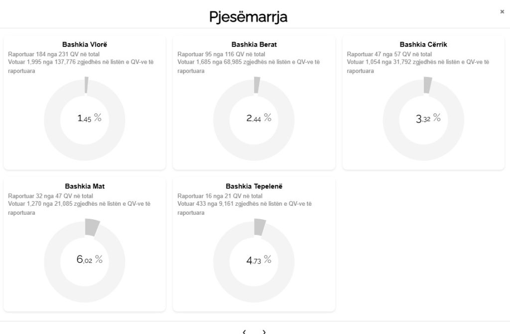 Në Bashkinë e Vlorës, janë raportuar 184 nga 231 qendra votimi, me një pjesëmarrje prej 1.45%. Në Bashkinë e Beratit, janë raportuar 95 nga 116 qendra votimi, me 2.44% pjesëmarrje, ndërsa në Bashkinë Cërrik janë raportuar 47 nga 57 qendra, me një përfshirje prej 3.32%.