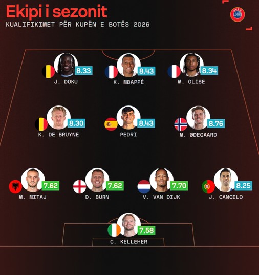 Mario Mitaj është vërtet unik. Mbrojtësi i majtë i Kombëtares shqiptare është përfshirë nga “Sofascore” në formacionin e sezonit kualifikues për Botërorin në Europë, duke u vlerësuar si më i miri në pozicionin e tij. Formacioni përbëhet nga emra të mëdhenj të Holandës, Anglisë, Portugalisë, Spanjës, Belgjikës dhe Francës, çka e bën praninë e Mitajt edhe më domethënëse.