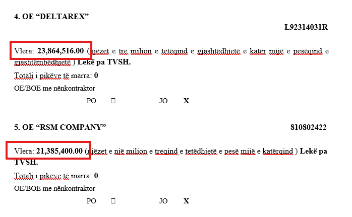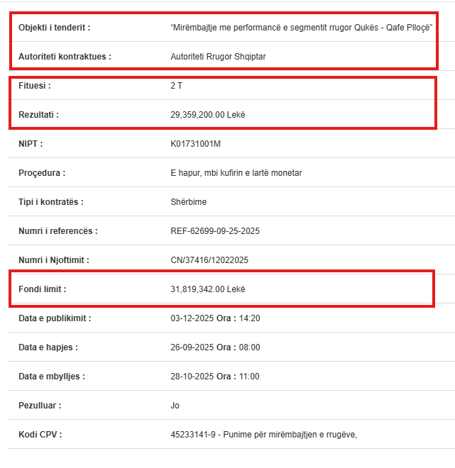 Vlera fituese: 29,359,200 lekë pa TVSH, rreth 360 mijë euro me TVSH