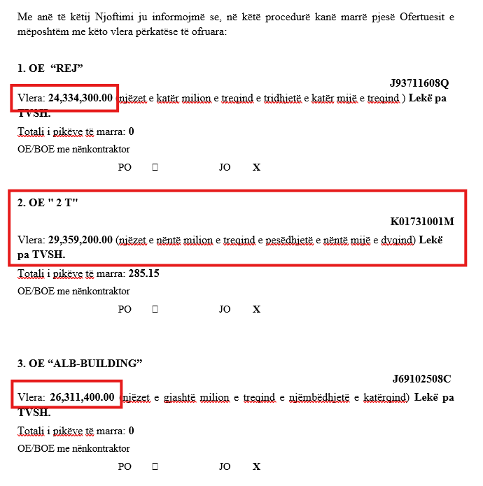 Por skandali nuk ka mbaruar: Oferta më e lartë fiton kundër 4 ofertave më të ulëta. Hetimi i dokumenteve të tenderit nga Joq Albania tregon diçka edhe më të rëndë: 4 kompani të tjera kanë ofruar çmime më të ulëta se 2T. Prapëseprapë, fituese është shpallur kompania e Artan Sakos.