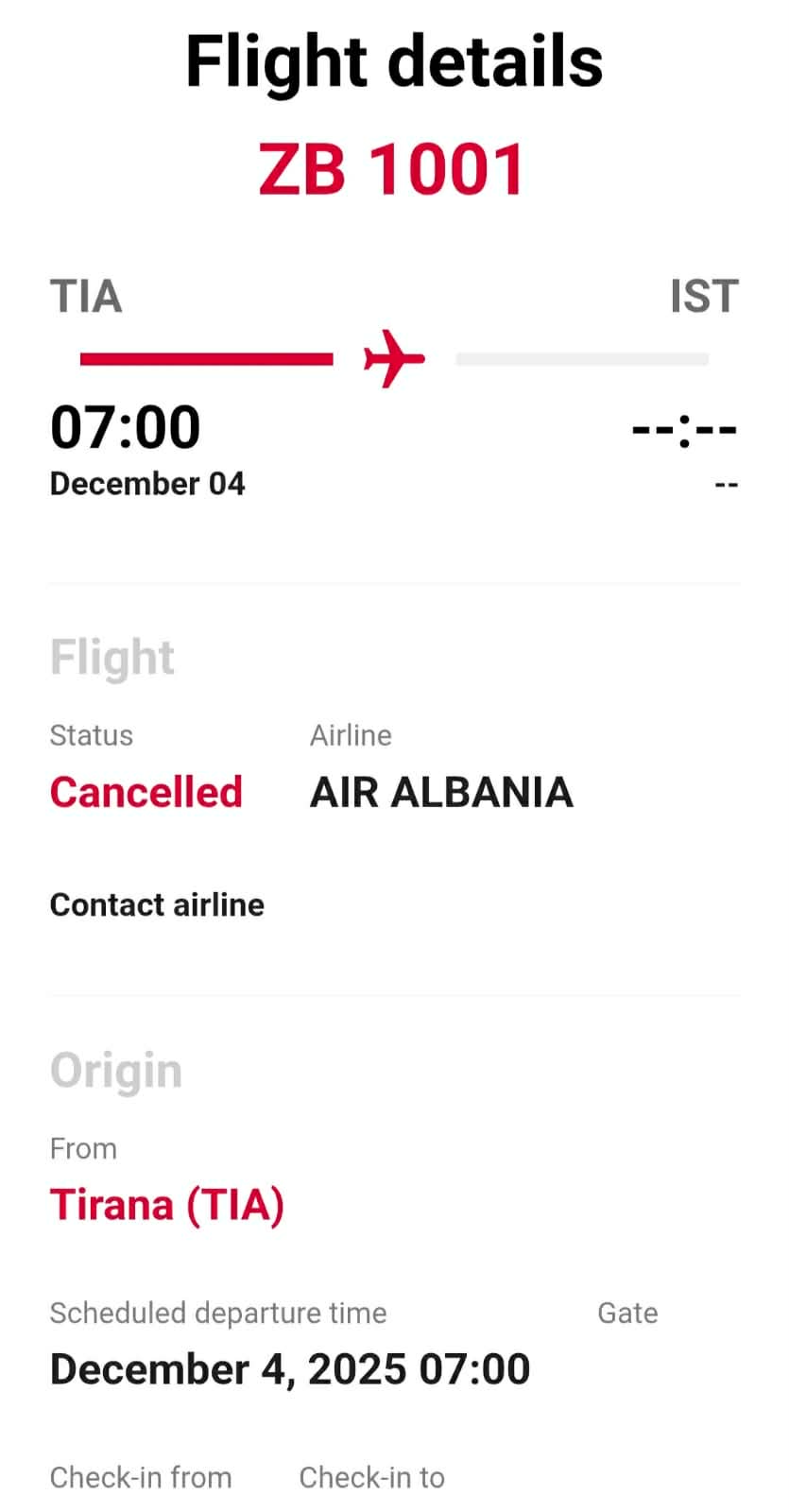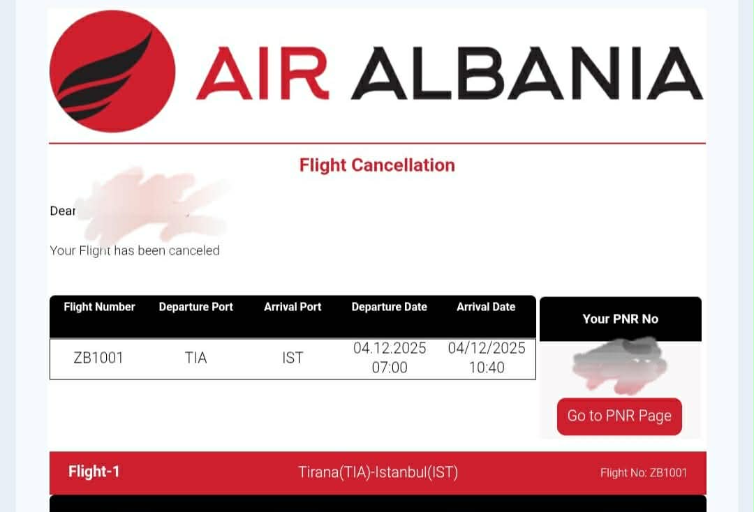Lidhem disa here me Turkish Airlines per te konfirmuar anullimin, dhe sipas tyre nuk ka asnje anulim. Imagjinoni, kulmi i absurdit: dy kompani që operojne te njejtin itinerar japin dy informacione te kunderta. Nuk ka transparence, nuk ka pergjegjesi, asnje sqarim te qarte. Prej kohesh po degjojme dhe shohim problematika me Air Albania: anulime në moment të fundit, ndryshime orari pa paralajmerim, dhe mungese totale serioziteti. Kjo po u prish udhetimet dhe planet qindra shqiptareve çdo jave. Pervecse i anullojne, nuk kthejne asnje pagese mbrapsht dhe nuk mbajne asnje pergjegjesi per kompensim demi.