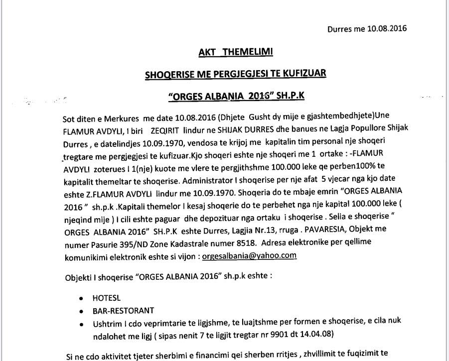 Sipas të dhënave, kompania “Orges Albania 2016” ka marrë dy stacione plazhi të koduara si “DR 515” dhe “DR 516”. Firma është themeluar në vitin 2016 nga Flamur Avdyli dhe fillimisht ka vepruar në fushën e bareve dhe restoranteve, përpara se të shtrihej në aktivitetin e stacioneve të plazhit.