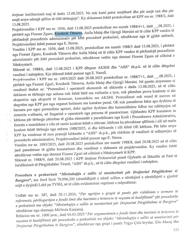 Sipas deklarimeve të biznesmenit, për të verifikuar në kohë reale një tërheqje nga procedurat e ankimimit ishte e nevojshme të ketë një autoritet brenda KPP-së. Emri i përmendur ishte Kreshnik Tërnova, i cili dyshohet të ketë lidhje me biznesmenin Ermal Beqiri. Për më tepër, dosja zbulon se vendimet për ndërprerjen e procedurave administrative janë firmosur nga nënkryetari i KPP, Fiorent Zguri, ndërsa pjesë e vendimeve kanë qenë edhe anëtarët Kreshnik Tërnova, Anila Malaj dhe Gjergji Mersini.